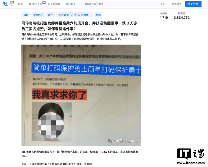 IT之家8月24日消息,今年8月时有网传消息称奇瑞汽车一校招生“凯哥”(化名)因不满公司周六加班开会,邮件回复拒绝参加事业部的年中大会,相应消息引起奇瑞集团内部员工和网友关注热议。